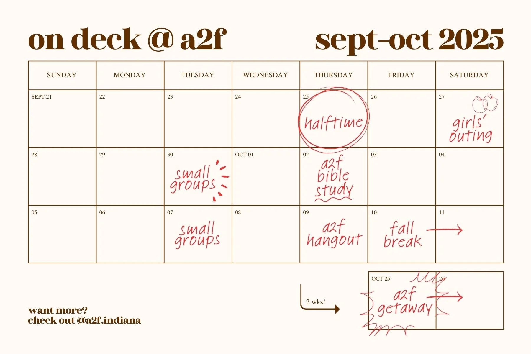 Acts2 Fellowship (A2F) is a Christian fellowship at Indiana University dedicated to growing in faith and building meaningful, lasting relationships in college. We welcome students from all backgrounds—whether you’ve been part of the church your whole life or are just curious about life or faith! We do all sorts of fun things like playing sports on Woodlawn field, building community groups whether large or small, and answering big questions based on the bible! Whether you are a new student at IU (congrats!) or gotten well used to this campus in the past few years, we’d love to get to know you!